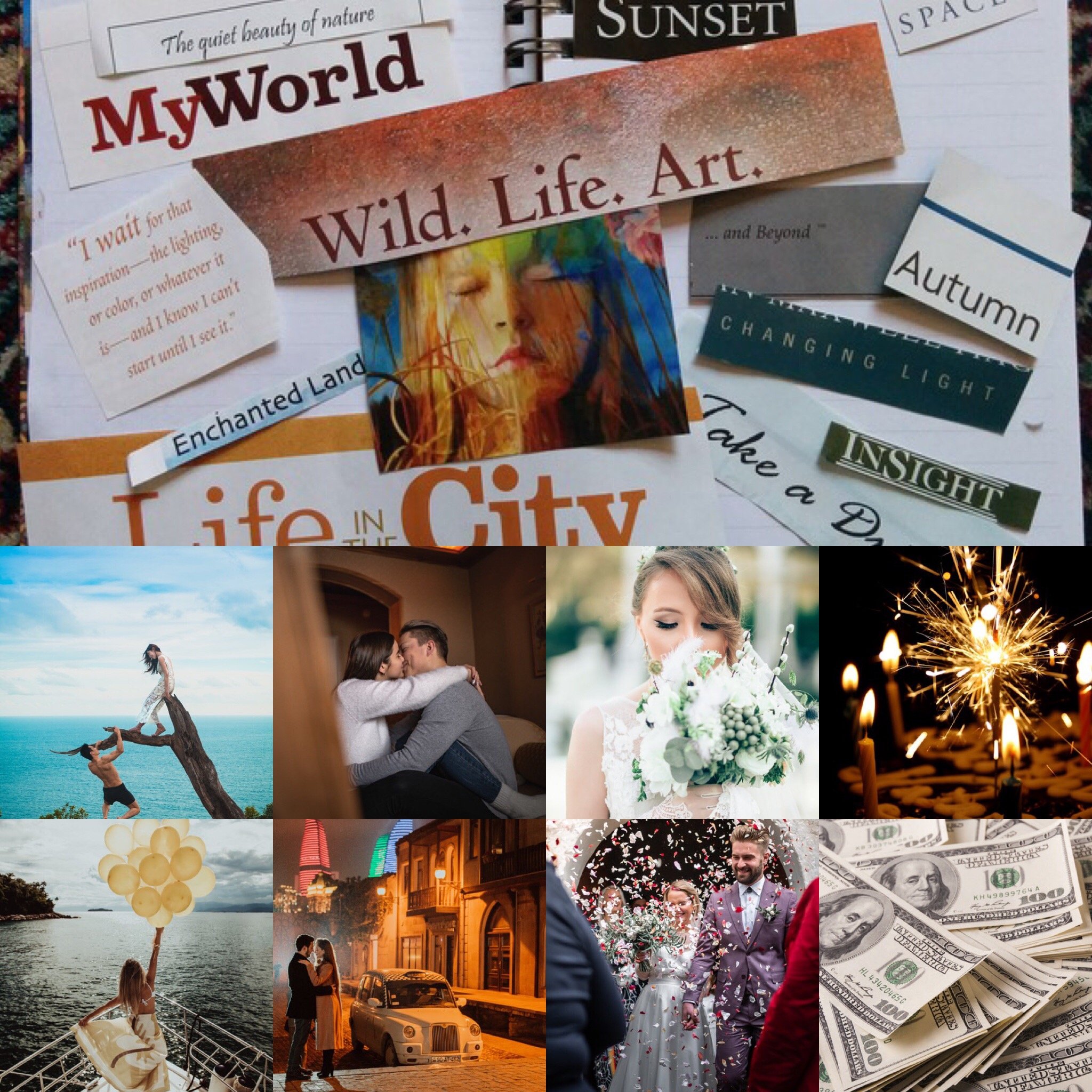 Now that we’ve talked through some of the essential ingredients to focus on when planning and talking through your future with your partner, let’s get to the fun part: actually creating a vision board together. A vision board is essentially a collection of images, words, and objects that are a visual representation of your goals or “vision” for the future. This can be done physically or can be a digital creation, whatever you are most comfortable with. There is no right or wrong way to create a vision board, but the overall theme and goal should be choosing images or words that inspire you or make you feel like you are manifesting your dreams and goals. It should be a visual reminder of your intentions, whether for the year or for the next 5-years. Vision boards help you reaffirm your intentions and goals, as well as help you to clarify what those goals actually are.
