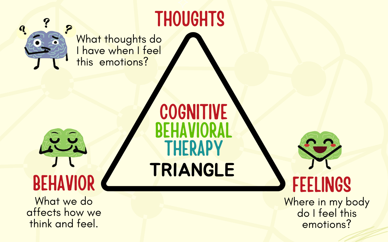 When explaining CBT to my clients, I usually begin by teaching them about a concept called the “CBT Triangle” (see image on post). This triangle is a visual representation of the connection between thoughts, feelings, and behaviors. The idea is that each element directly influences the other, which leads to a cycle that can increase distress.